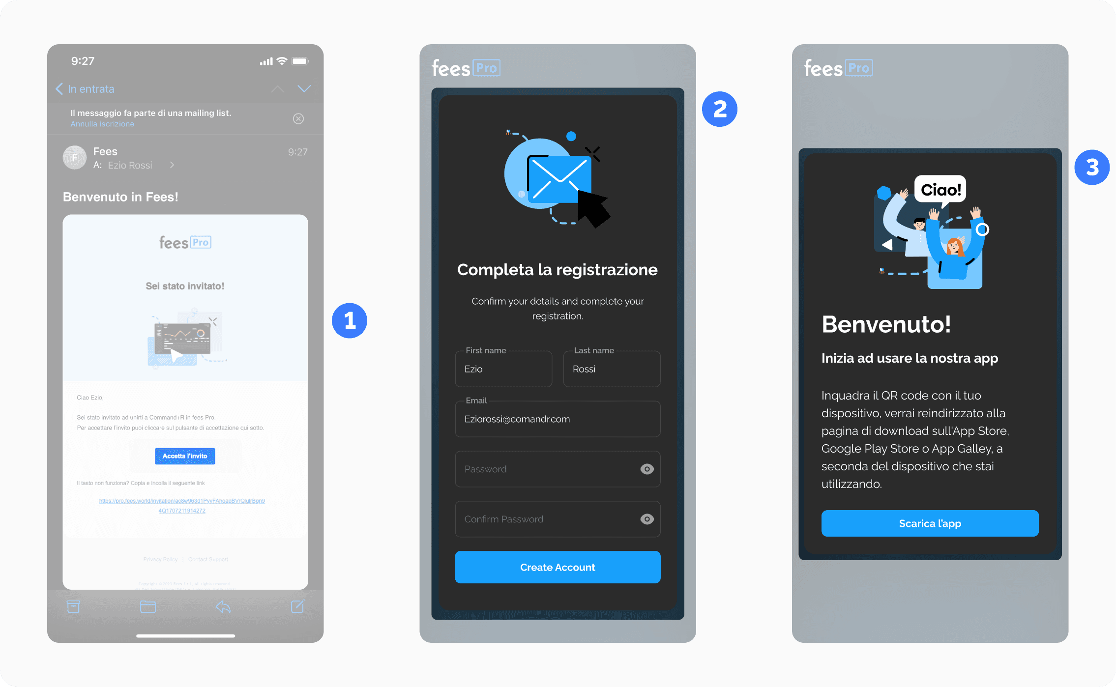 Infine dovrai scaricare 3 l'applicazione di fees sul tuo dispositivo ed entrare nell'organizzazione in cui sei stato invitato.