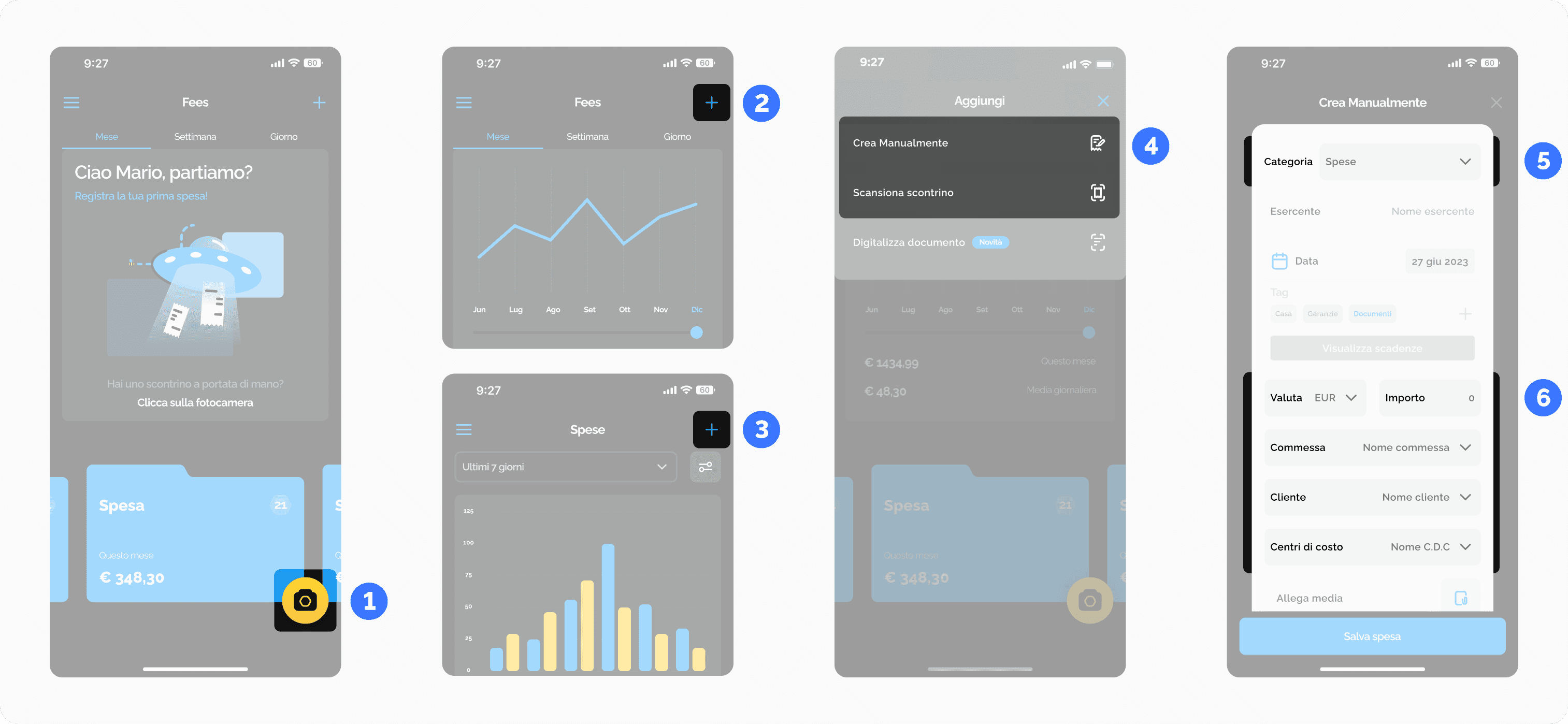 Nel menu "Aggiungi", seleziona l'opzione per caricare una spesa manualmente o importare una spesa tramite scansione 4.