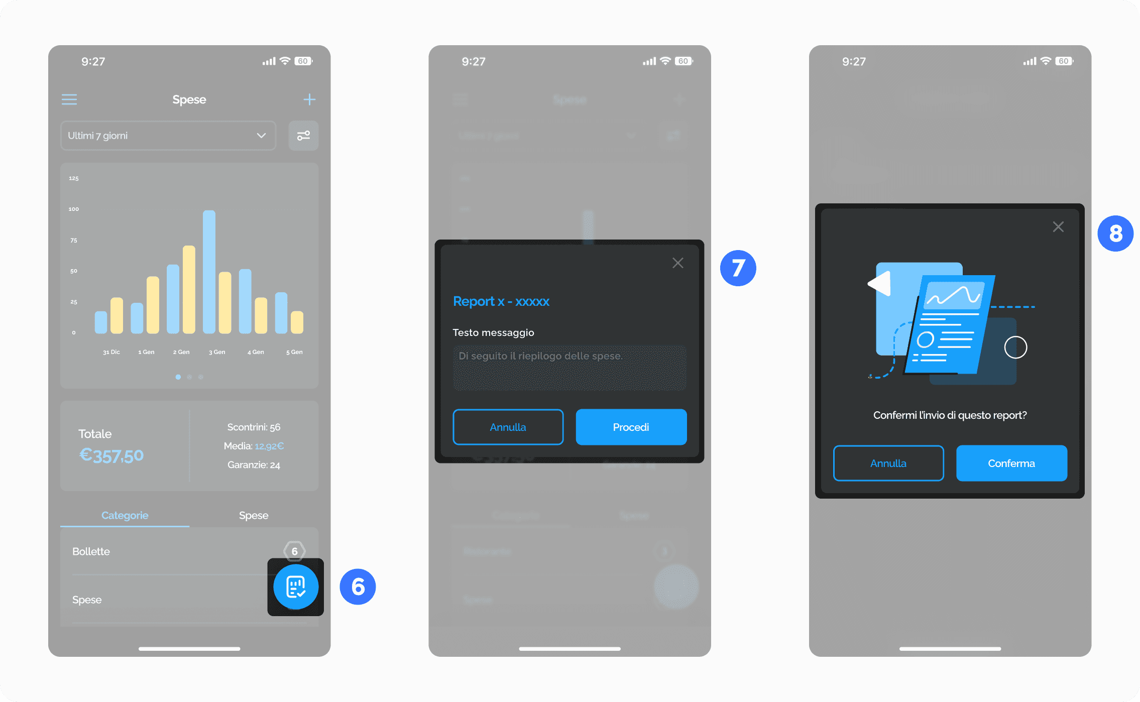 Filtrate le spese da includere nel report, dalla pagina "Spese" clicca il tasto blu 6, apparirà una nuova finestra 7 dove In base alle linee guida della tua organizzazione potrai modificare il nome del Report che appare come "report X - XXXXXX".