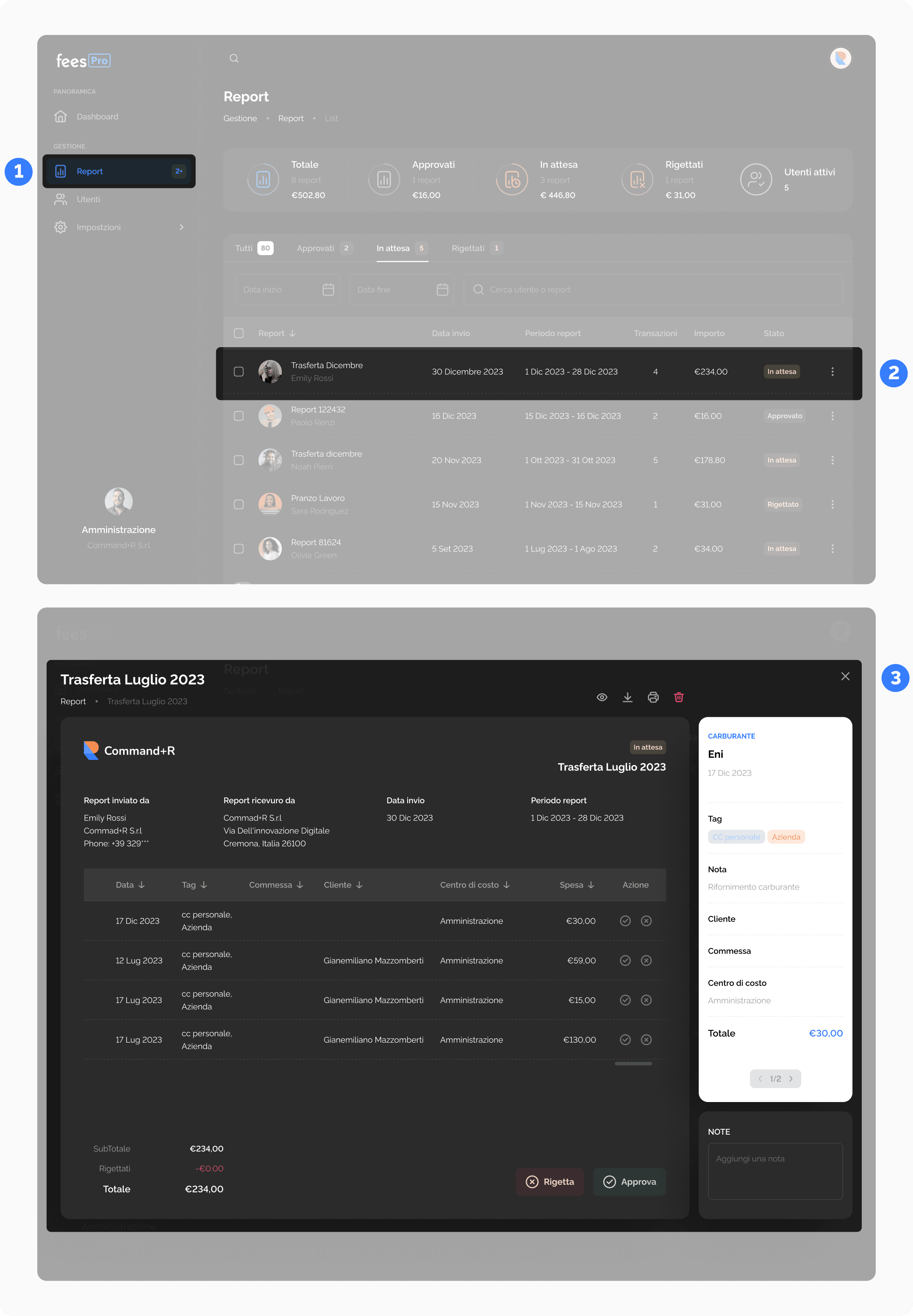 I Report di fees Pro sono dei rapporti riepilogativi di voci di spesa e documenti scambiati fra l'amministratore dell'organizzazione e gli utenti inseriti all'interno della stessa.