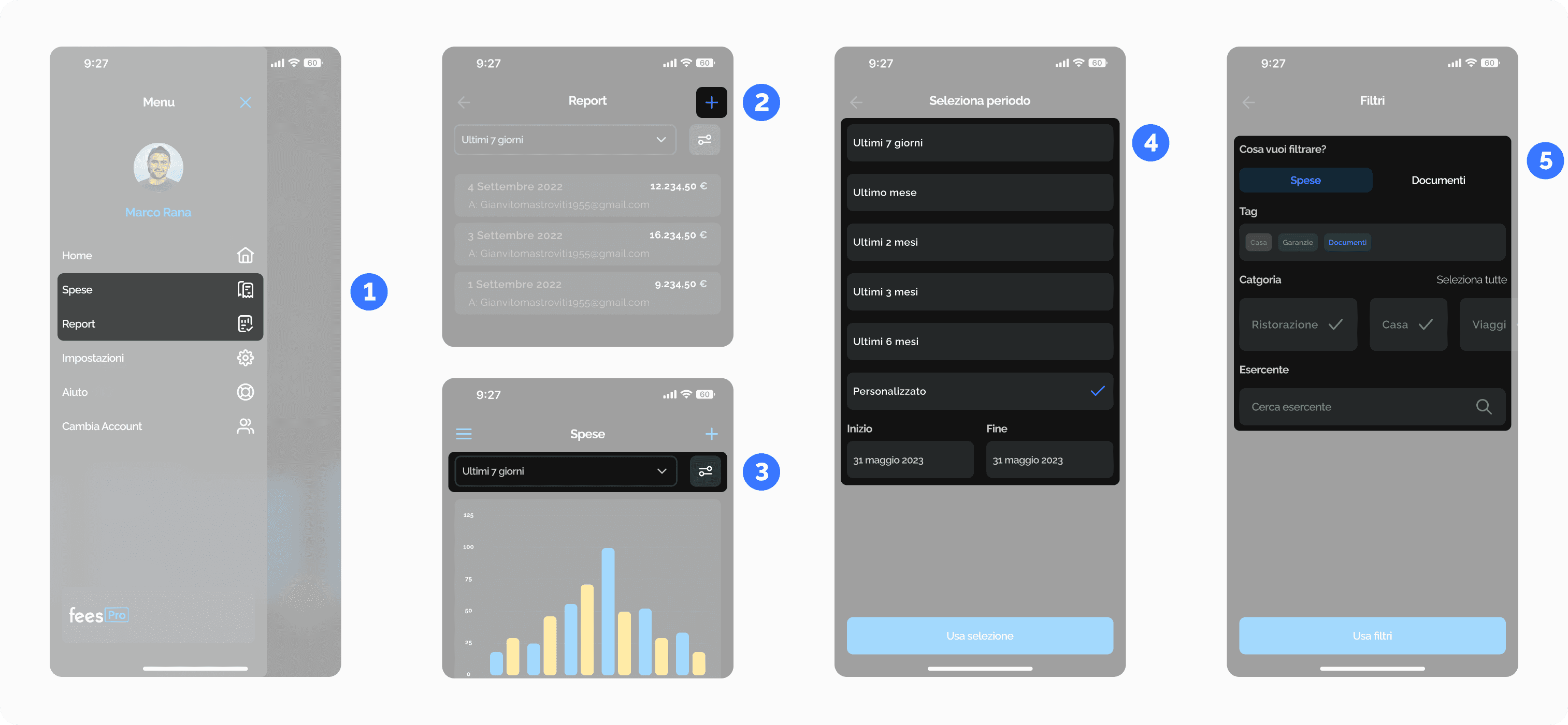 Nella pagina "Spese", seleziona i filtri 3 per individuare le spesa che desideri includere nel report. Potrai filtrare il "Periodo" 4 e le "Categorie, gli Esercenti e i Tag" 5.
