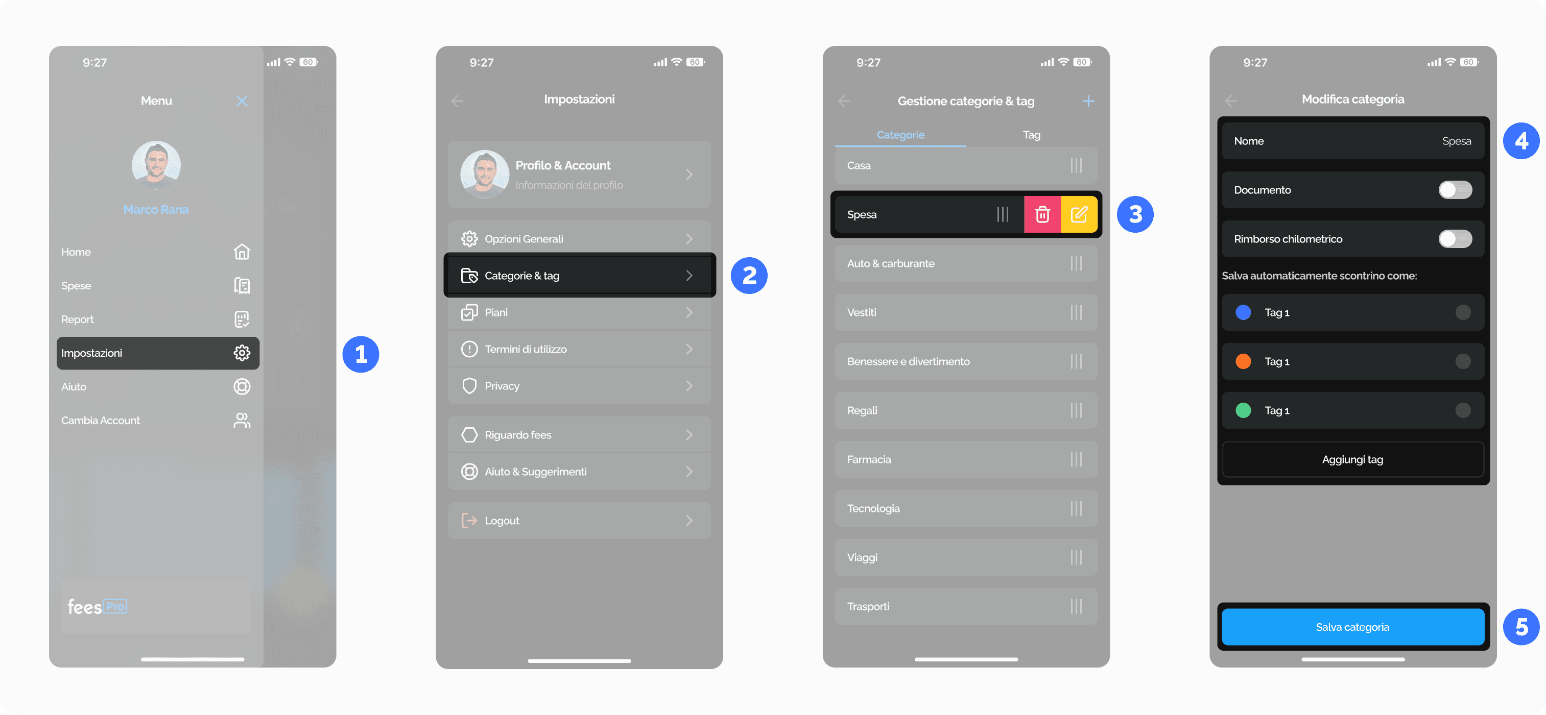 Per modificare una categoria, dovrai accedere alla pagina "Impostazioni" 1 tramite l'icona del menu a scomparsa situata nella pagina principale.